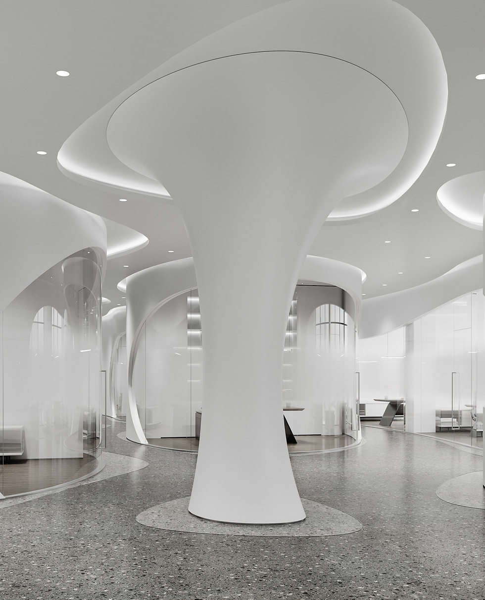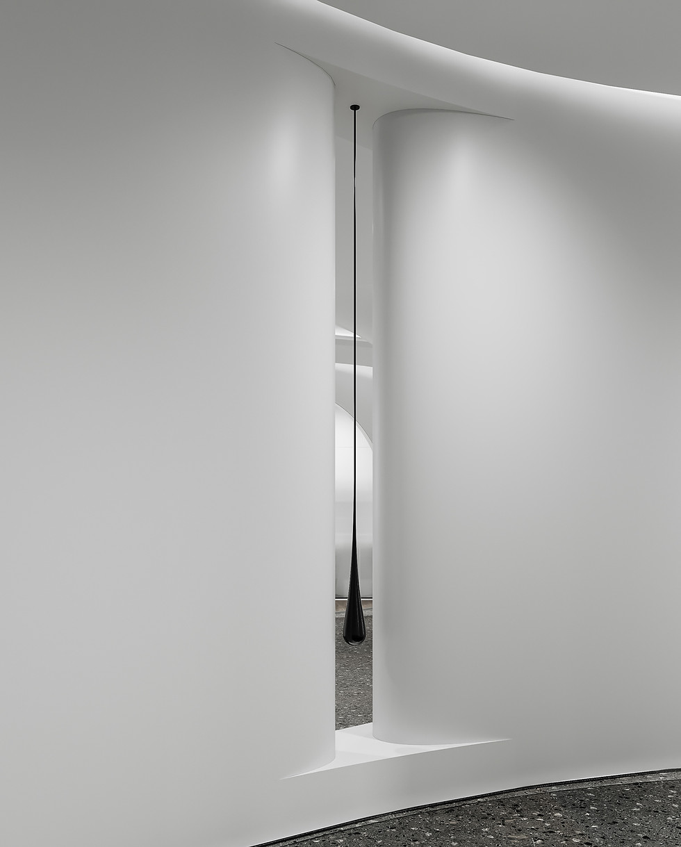 The curvilinear shape of the floor flows gently along the corridor in two different textures and colors of terrazzo, which is then echoed by the light strips and shapes in the ceiling. Walk into the showroom through a welcoming corridor of parametrically processed repeating structural units. With the curved entrance surface of the stylized wall embedding the glass diagonally into the elevator hall, the visitor's attention is brought into the interior, reflecting the ingenious point of pebbles striking water and rippling water everywhere.